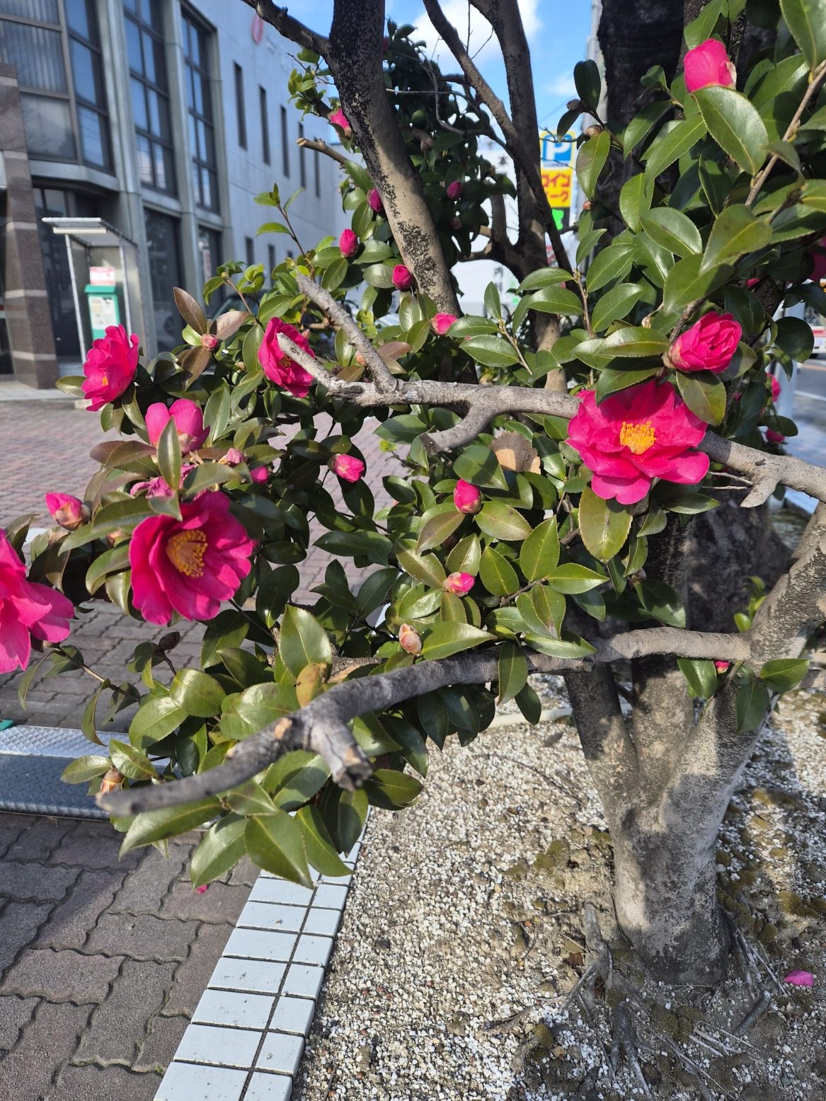 信号待ちをしていたら、左手に寒椿が。